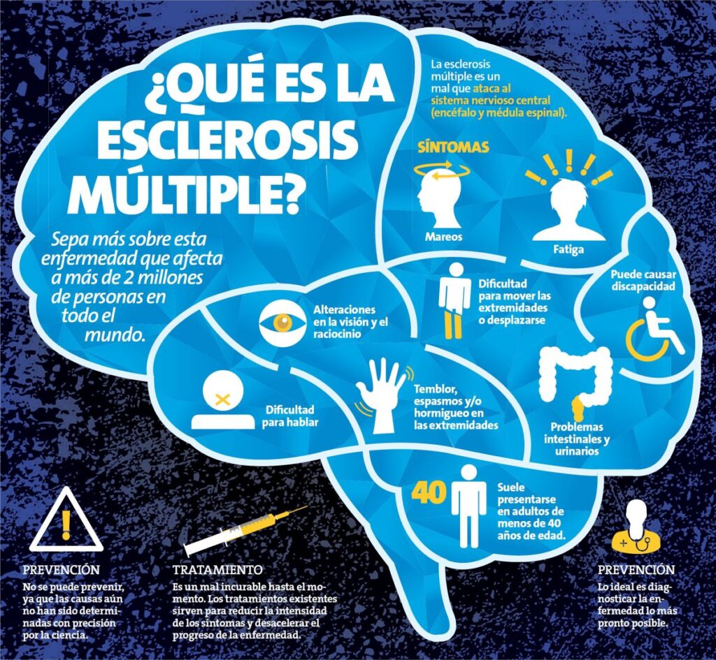 Se trata de una enfermedad de causa desconocida, en la cual aparecen una serie de lesiones en el sistema nervioso central. El rasgo más característico de esta enfermedad es la perdida de mielina, que es la sustancia que rodea y protege los nervios.