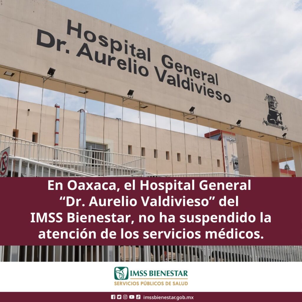 La Coordinación Estatal del IMSS Bienestar en Oaxaca y los Servicios de Salud de la entidad han constatado que la operación y continuidad de los servicios médicos en el Hospital General “Dr. Aurelio Valdivieso”, ubicado en la capital oaxaqueña, no ha sido suspendida.